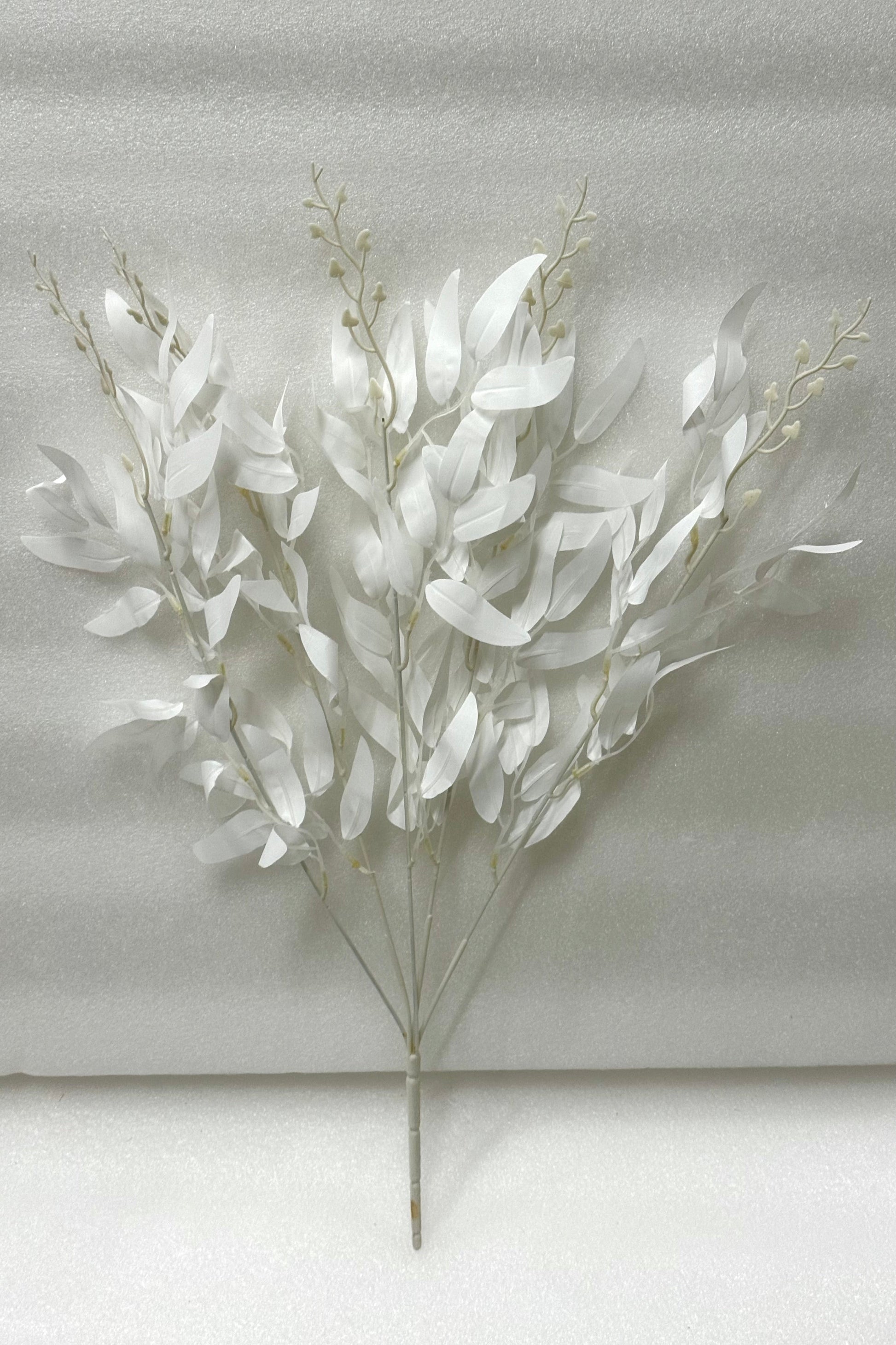 White artificial willow leaf spray featuring slender, flowing leaves for a soft and airy look. Lightweight and durable, perfect for bouquets, centerpieces, arches, and elegant event décor.